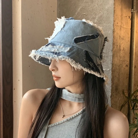 Fashion Niche Japanese Raw Edge Splicing Patch Denim Bucket Hat