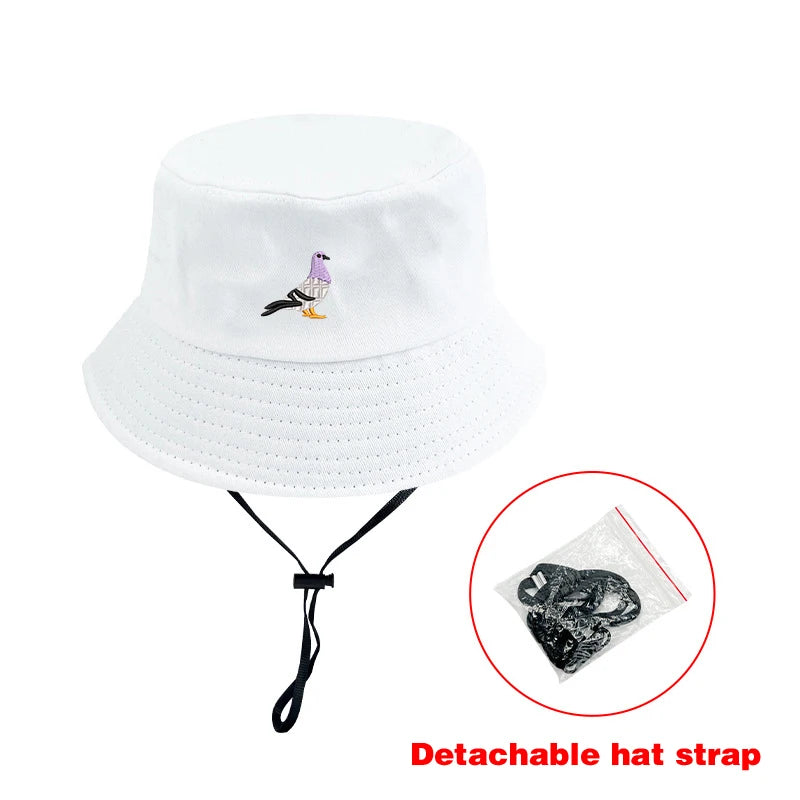 Crafted from breathable cotton, this embroidered pigeon bucket hat offers unisex appeal and practical style. Featuring a detachable strap for secure wear, it’s ideal for outdoor activities across summer and autumn. Lightweight and versatile, this fisherman-style bob hat is perfect for travel, providing sun protection while enhancing your casual look.