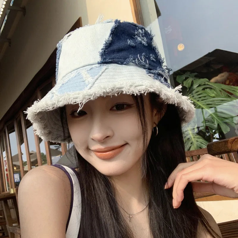 Fashion Niche Japanese Raw Edge Splicing Patch Denim Bucket Hat